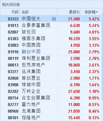 智通财经APP获悉,内房股涨势延续,中国恒大(03333)领涨板块,截至14时42分,中国恒大(03333)涨5.42%,报价21.4港元,合景泰富(01813)涨5.24%,报6.63%,碧桂园(02007)涨4.01%,中国奥园(03883)涨3.13%,融创中国(01918)涨2.79%。