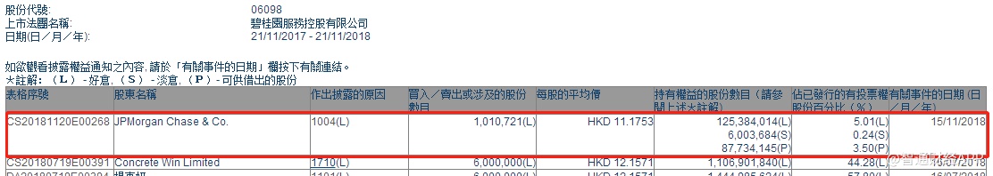 智通财经APP获悉,根据联交所资料显示,摩根大通于11月15日增持碧桂园服务(06098)101万股,每股作价11.18港元,总值1129.18万港元,最新持股量增至5.01%。