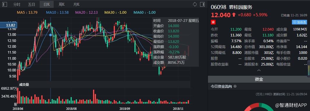 截至今日收盘,碧桂园服务(06098)报12.04港元,涨5.99%。