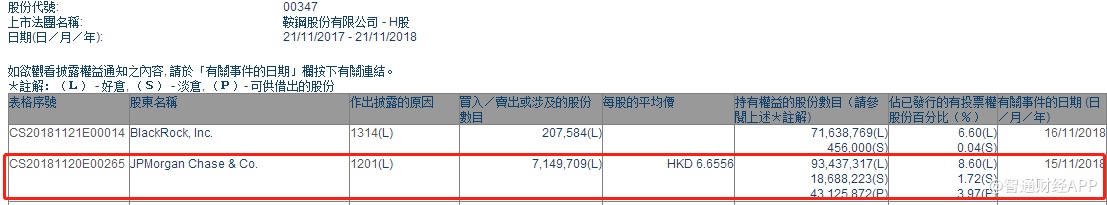 智通财经APP获悉,根据联交所资料显示,摩根大通于11月15日减持鞍钢股份(00347)715万股,每股作价6.66港元,总值4761.9万港元,最新持股量减至8.60%。