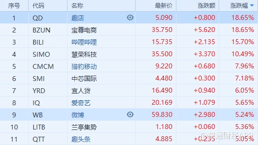 截至发稿,腾讯控股(ADR)涨4.35%,趣店(QD.US)涨18.65%,哔哩哔哩(BILI.US)涨15.7%,猎豹移动(CMCM.US)涨7.96%,宜人贷(YRD.US)涨6.05%,爱奇艺(IQ.US)涨5.65%,微博(WB.US)涨5.24%。