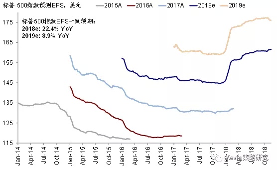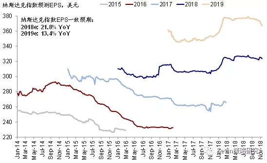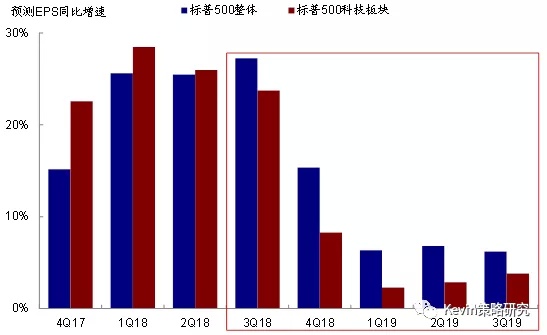 从整体市场而言,目前标普500指数12个月动态估值已经回落至15.4倍左右,低于历史均值(15.8倍),但科技股相对依然偏高一些。美股盈利未来面临增速回落和成本上升的压力,但预计还会维持相对稳健的增长水平(当前市场一致预期预计2019年EPS增速约为9%左右)。