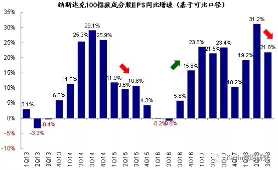 我们昨天的点评《简评:科技股再度拖累美股下跌,风格轮动继续》和《美股三季度业绩:增长依然强劲,但压力逐渐增加》中梳理的三季度业绩情况就呈现出明显的金融加速、科技减速的迹象。与此同时,从一致预期的角度,市场也预计未来科技板块增速会慢于整体市场,这在估值、情绪因素并不占优势的背景下,可能会进一步加大投资者对科技板块的担忧情绪。近期纳斯达克的盈利下修幅度就明显要大于标普500指数。
