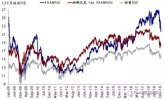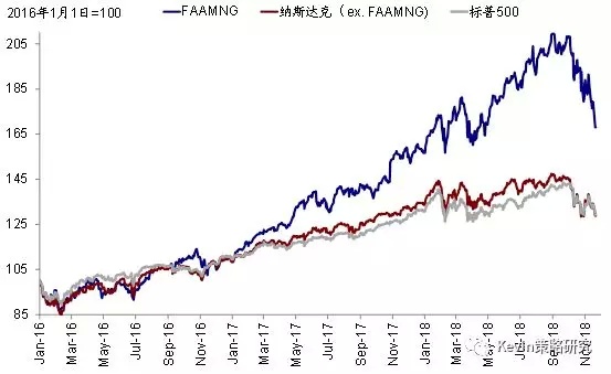 科技股的压力来自哪?近期科技股的持续下跌引发了投资者的普遍关注,呈现出明显的风格轮动的情形。从10月初的高点以来,标普500指数下跌9%,纳斯达克跌幅为14%,而科技龙头股如FAAMNG的跌幅已经高达20%。简言之,此前持续跑赢所累积的高仓位和获利盘和相对整体市场的高估值是科技股的主要问题,这一问题在近期一些公司业绩不及预期和投资者开始担心未来增长前景(比如苹果的出货量、以及贸易摩擦对一些科技硬件和芯片板块的影响)背景下会得到更大程度的释放。