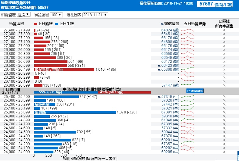 智通财经APP获悉,截至11月21日,恒指最新的牛熊街货比例55:45。从瑞信恒指牛熊证街货分布图中得到的数据显示,熊证街货重货区在26400-26499区间,该区间熊证数量为1010张,比上一交易日增加185张;最多新增也在这一区间。牛证中重货区在25000-25099区间,该区间最新牛证数量为1370张,比上一交易日减少328张;最多新增在25200-25299区间,新增201张。