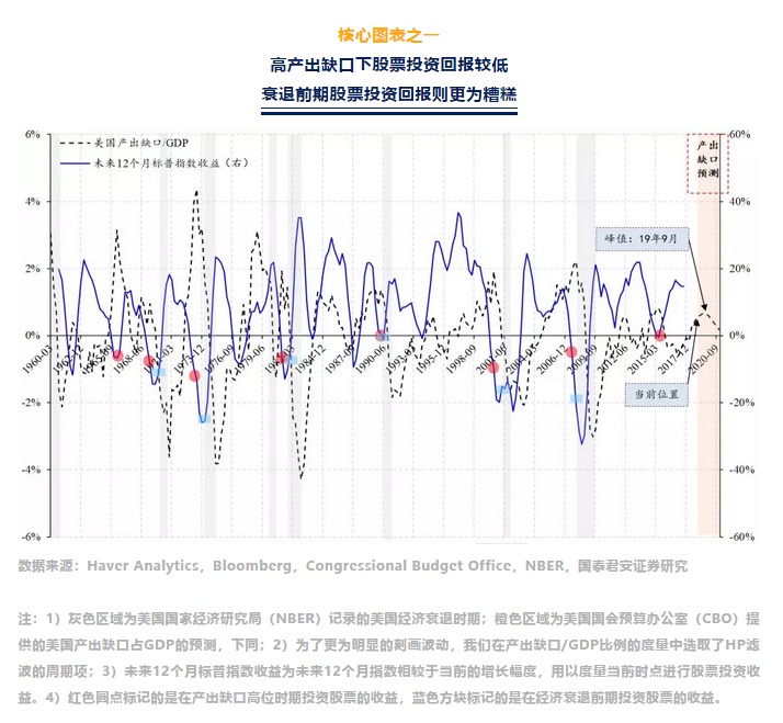 从60年代以来美国产出缺口与投资收益的关系来看,在经济周期的赶顶时期或产出缺口高位时期,买入持有美国股票市场的收益较前期均明显回落,基本没有收益或负收益(核心图表之一的红色圆点)。