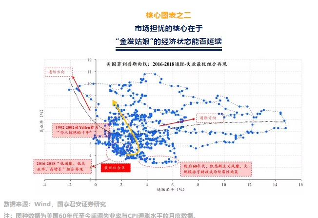 2016-2018年美国经济处于菲利普斯曲线的最优区,高增长、低通胀的这种经济状态也被称之为“金发姑娘经济”,而这种经济状态的最近一次出现是在90年代。