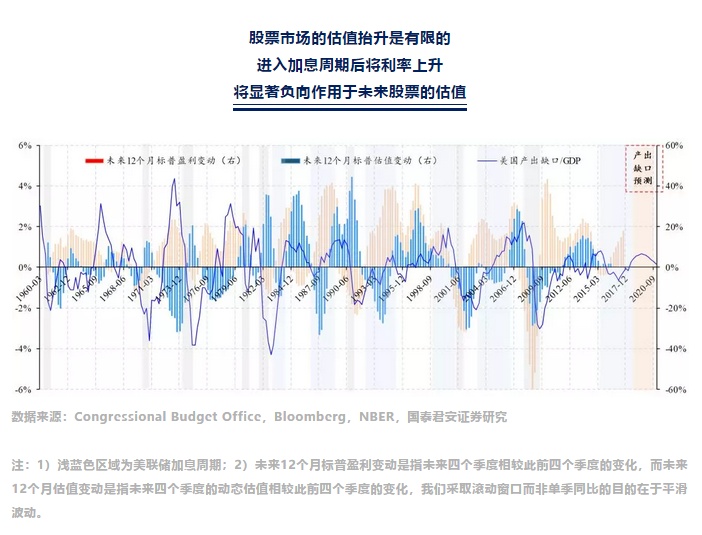 我们进一步考察了产出缺口、股票盈利与估值以及加息周期之间的关系,可以看到在加息周期中,利率上升对未来股票估值的负向拉力作用明显。