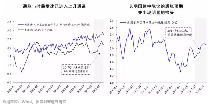 从数据来看,不论是实际的薪资、通胀水平还是长期国债中隐含的通胀风险,均在近一年明显的上升。