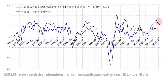 根据我们的模型显示,从18年四季度开始,美国投资增速将放缓,目前实际投资增速正高位悬停。
