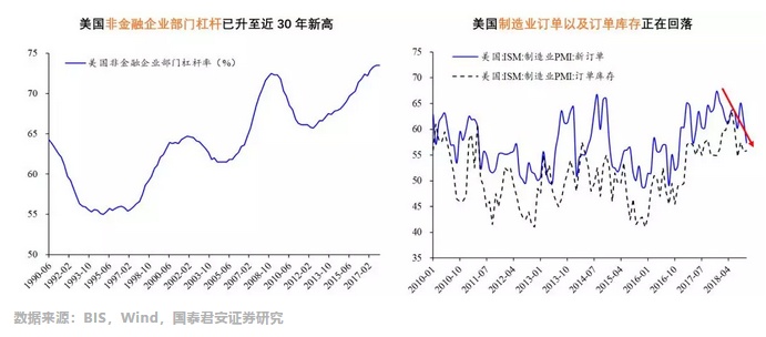 另一个重要的约束条件是,美国非金融企业部门的杠杆处于历史高位,而近期明显上升的全球经济不确定性以及制造业新订单的回落,也在预示投资的边际放缓。