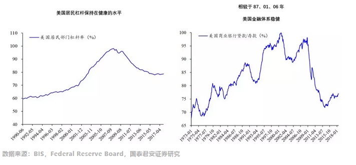 第三,从微观层面来看,美国居民部门较低的杠杆水平以及稳健的银行系统(金融体系的风险较低)将提供经济系统足够的安全垫。