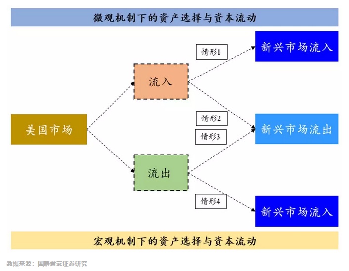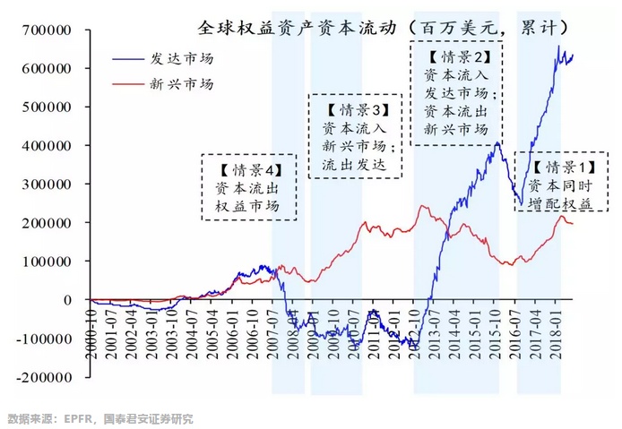 发达经济下行企稳叠加流动性仍充裕,权益资金从发达流向基本面良好的新兴(危机后宽松模式情景3是典型);