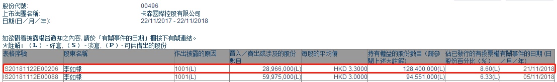 智通财经APP获悉,根据联交所资料显示,李如樑于11月21日增持卡森国际(00496)2897万股,每股作价3.30港元,总值9560.10万港元,最新持股量增至8.60%。