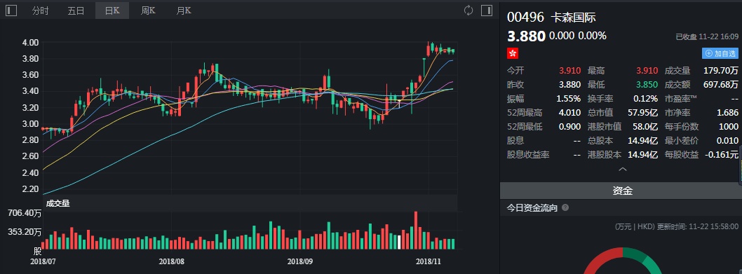 截至今日收盘,卡森国际(00496)报3.88港元,无涨跌。