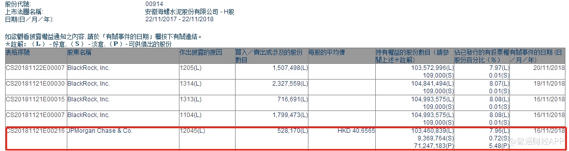 智通财经APP获悉,根据联交所资料显示,摩根大通于11月16日减持江苏海螺水泥(00914)53万股,每股作价40.66港元,总值2154.98万港元,最新持股量减至7.96%。