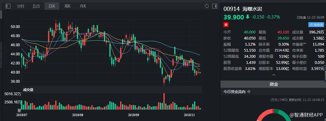 截至今日收盘,海螺水泥(00914)报39.9港元,跌0.37%。