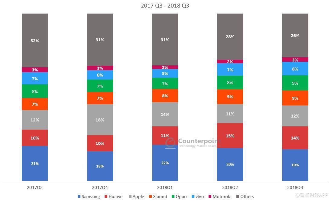 智通财经APP获悉,市场研究公司Counterpoint Research公布报告称,2018年第三季度全球智能手机总出货量为3.8亿台,三星、华为和苹果公司的出货量分列前三位。
