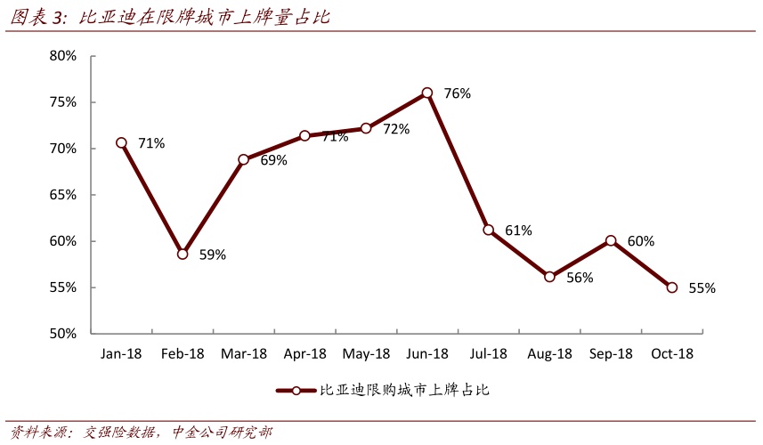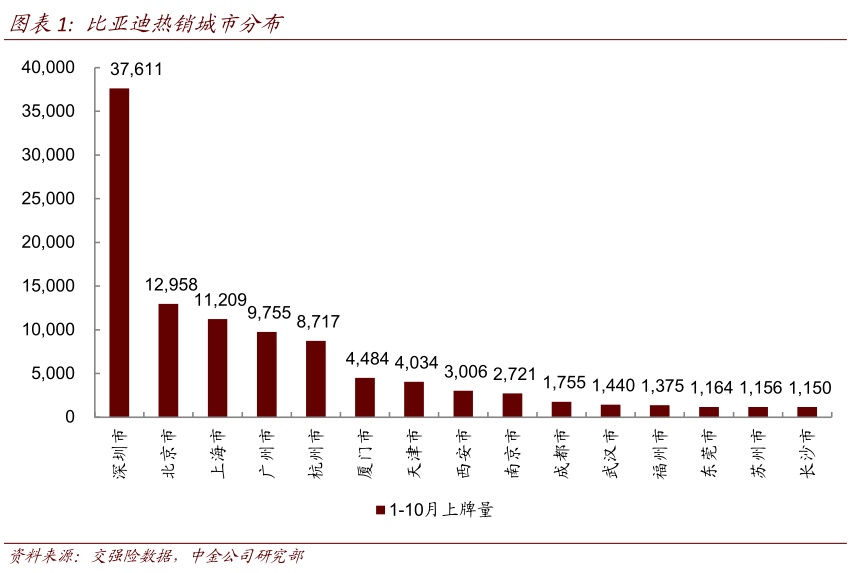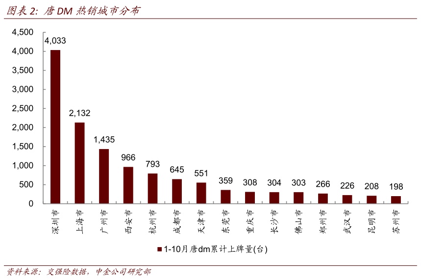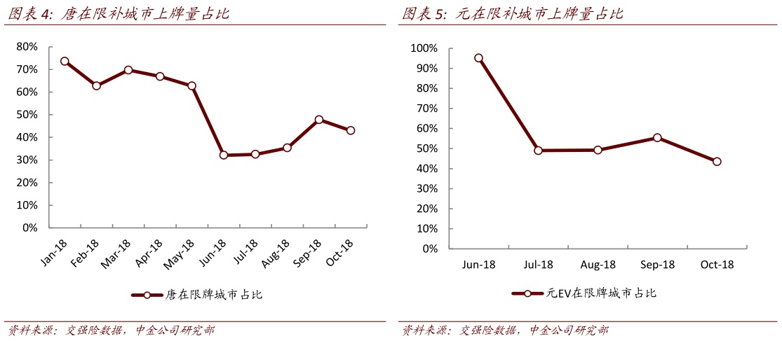 比亚迪在新能源汽车领域已形成较强的品牌力。我们认为公司凭借多年的技术和经验积淀,已经成为部分消费者心目中新能源汽车首选品牌。其中,随着全新唐 dm、元 EV 的上市,非限购城市的消费者接受程度显著提高。10 月,比亚迪在非限牌城市的上牌量占比已达 45%,其中唐 dm 和元 EV 非限牌城市的销量均超过50%。这意味着即使在没有牌照差异的情况下,更多消费者开始选择比亚迪的新能源汽车。