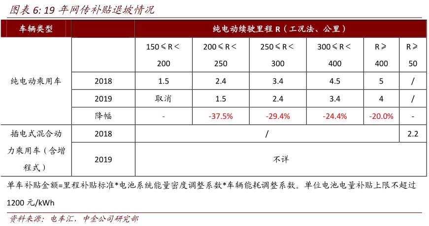我们认为,19 年新能源补贴政策依然会向高续航里程 EV 和 PHEV 倾斜。根据网传 2019年补贴版本,续航里程为 300-400km 及 400km 以上的纯电动车型国补金额将分别由 4.5万和 5 万下降至 3.4 万和 4 万,降幅分别为 1.1 万和 1 万元,国补+地补合计退坡金额分别达 1.7 万和 1.5 万,基本可通过降本进行消化。