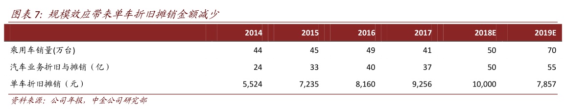 规模效应带来单车折旧与摊销金额的下降。不考虑客车(轻资产,参考宇通,单车折旧约 1 万元)及电池部分,2018 年公司汽车业务的折旧和摊销预计 50 亿元,单车折旧与摊销月 1 万元;若 2019 年新能源乘用车销量达 70 万台(燃油车 30 万台+新能源车 40 万台),单车折旧与摊销减少将达 2000 元以上。