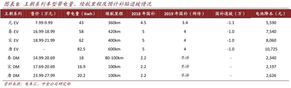 电池降本将缓解退补压力。目前公司 PHEV 带电量接近 20 度电;纯电动带电量从 40 度到 80 度不等,若 19 年电池降本达 10%,则