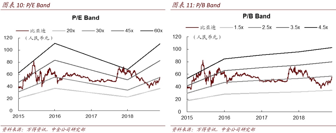 目前比亚迪A/H分别对应18年48.8x/44.8x P/E和19年28.7x/26.9xP/E,维持 2018 年和 19 年净利润预测分别为 30.92 亿和 52.53 亿,将比亚迪 A/H 的目标价分别由 60 元和 65 港币上调至 65 元(40.3x/43.6x P/E)和 70 港币(38.6x/41.6x P/E),上调幅度分别为 8.3%和 7.7%,上行空间分别为 17.5%和 23.4%,维持推荐。