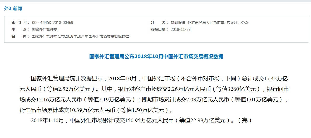 智通财经APP获悉,11月23日,国家外汇管理局公布2018年10月中国外汇市场交易概况数据。