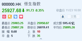 智通财经APP获悉,恒指早盘低开0.27%,报25950.07点。截至收盘,恒生指数跌91.73点或0.35%,报25927.68点,全日成交额达595.42亿。国企指数跌0.55%,报10388.53点,红筹指数跌0.34%,报4261.35点。
