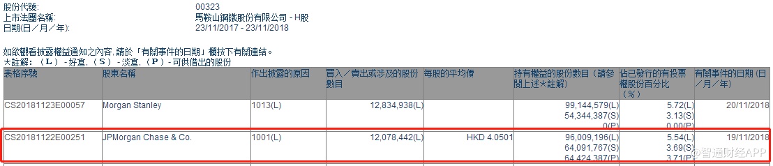 智通财经APP获悉,根据联交所资料显示,摩根大通于11月19日增持马鞍山钢铁股份(00323)1208万股,每股作价4.05港元,总值4892.4万港元,最新持股量增至5.54%。