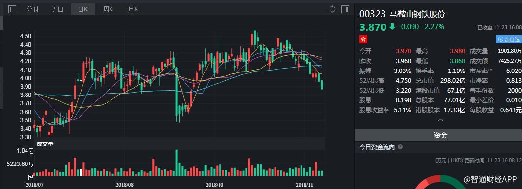截至今日收盘,马鞍山钢铁股份(00323)报3.87港元,跌2.27%。
