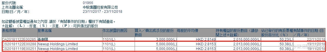 智通财经APP获悉,根据联交所资料显示,Newup Holdings Ltd于11月19日增持中骏集团控股(01966)500万股,每股作价2.82港元,总值1410万港元,最新持股量增至50.38%。