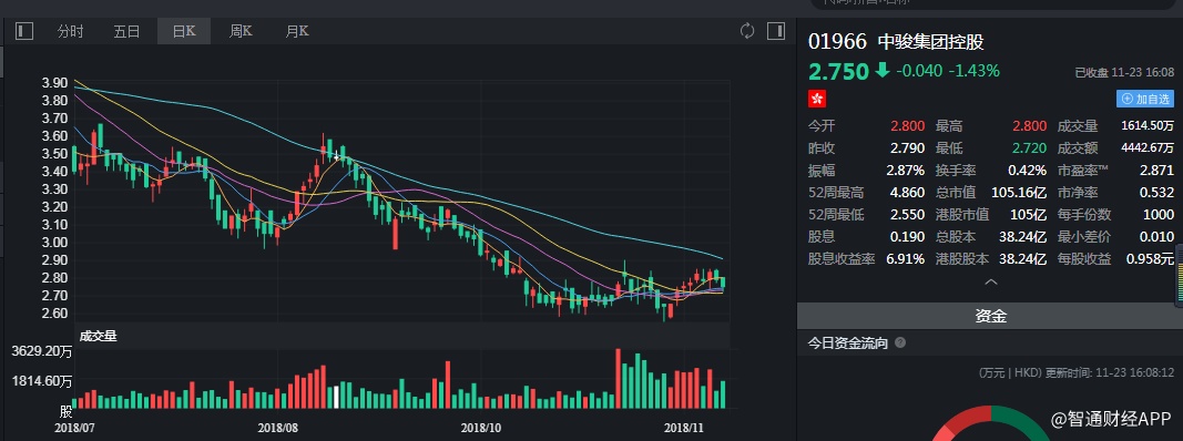 截至今日收盘,中骏集团控股(01966)报2.75港元,跌1.43%。