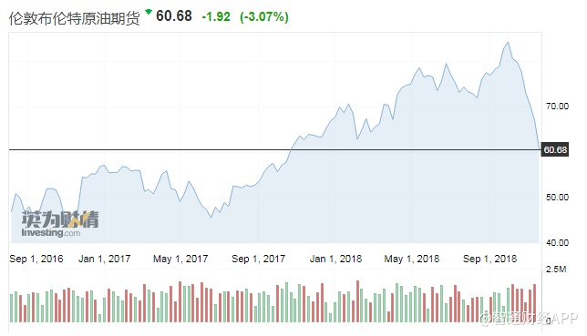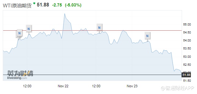 智通财经APP获悉,11月23日,国际油价再次延续暴跌,截至发稿,WTI原油期货跌逾5%,报51.88。布伦特原油报60.68,跌3.07%,两者均创2017年10月以来新低。