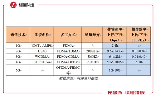 智通财经APP了解到,G即generation,5G即第5代通信技术。由于无线通信的传递媒介是电磁波,而电磁波又有不同的频率,因此针对不同频率范围的电磁波通信需要不同的技术支撑,目的是为了使通信更迅速,即单位时间有更多信息传递。