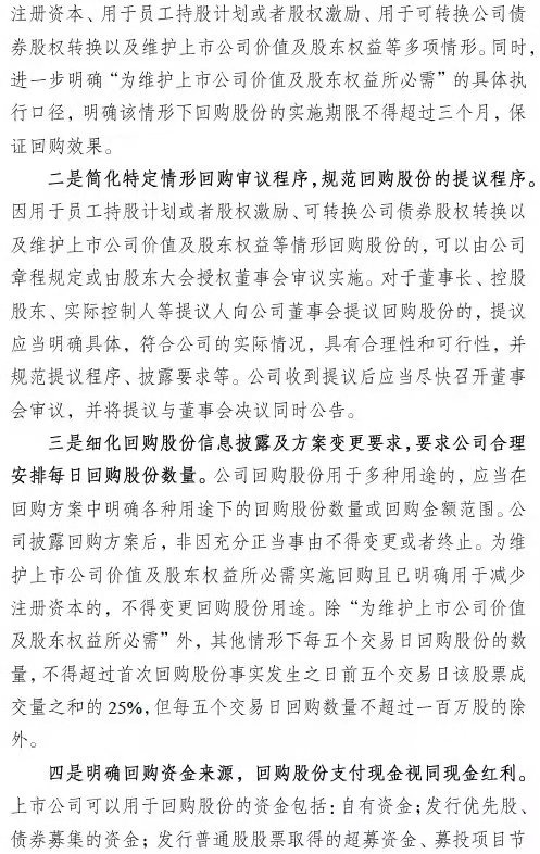 一是拓宽回购股份适用情形,明确“为维护上市公司价值及股东权益所必需”情形的回购要求。将回购目的拓宽为减少公司注册资本、用于员工持股计划或者股权激励、用于可转换公司债券股权转换以及维护上市公司价值及股东权益等多项情形。同时,进一步明确“为维护上市公司价值及股东权益所必需”的具体适用标准,明确该情形下回购股份的实施期限不得超过三个月,保证回购效果。