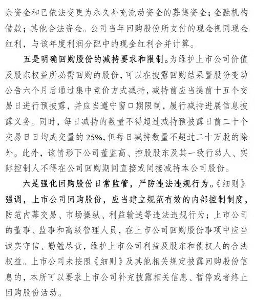 五是明确回购股份的减持要求和限制。为维护上市公司价值及股东权益所必需回购的股份,可以在披露回购结果暨股份变动公告六个月后通过集中竞价方式减持,减持前应当提前十五个交易日进行预披露,并应当遵守窗口期限制,履行减持进展信息披露义务。同时,每日减持的数量不得超过减持预披露日前二十个交易日日均成交量的25%,但每日减持数量不超过二十万股的除外。此外,该情形下公司董监高、控股股东及其一致行动人、实际控制人不得在公司回购期间直接或间接减持本公司股份。