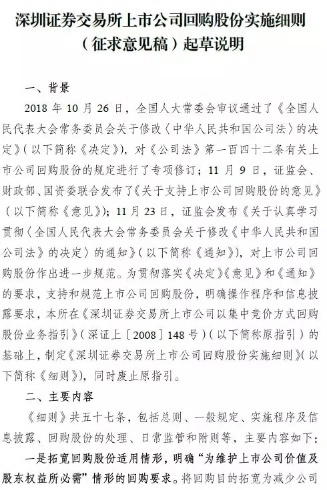 下为《深圳证券交易所上市公司回购股份实施细则》(征求意见稿)起草说明原文及《深圳证券交易所上市公司回购股份实施细则》(征求意见稿)全文: