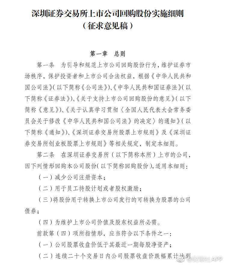 智通财经APP获悉,日前,深交所就《深圳证券交易所上市公司回购股份实施细则》(以下简称《实施细则》)向市场公开征求意见。这是深交所贯彻落实全国人大常委会关于修改《公司法》的决定、三部委《关于支持上市公司回购股份的意见》、证监会《关于认真学习贯彻〈全国人民代表大会常务委员会关于修改《中华人民共和国公司法》的决定〉的通知》等法律法规和文件精神,及时完善相关配套制度,切实响应市场需求,支持和规范上市公司依法实施股份回购的有力举措。