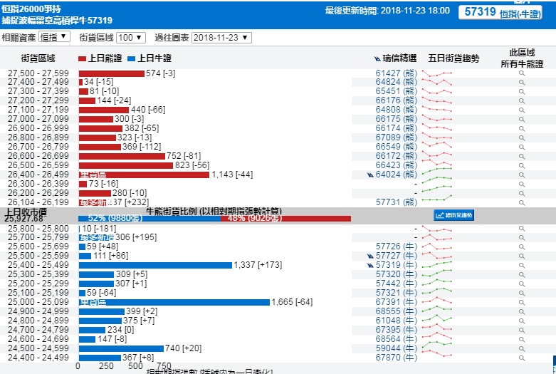 智通财经APP获悉,截至11月23日,恒指最新的牛熊街货比例52:48。从瑞信恒指牛熊证街货分布图中得到的数据显示,熊证街货重货区在26400-26499区间,该区间熊证数量为1143张,比上一交易日减少44张;最多新增在26104-26199区间,新增232张。牛证中重货区在25000-25099区间,该区间最新牛证数量为1665张,比上一交易日减少64张;最多新增在25700-25799区间,新增232张。