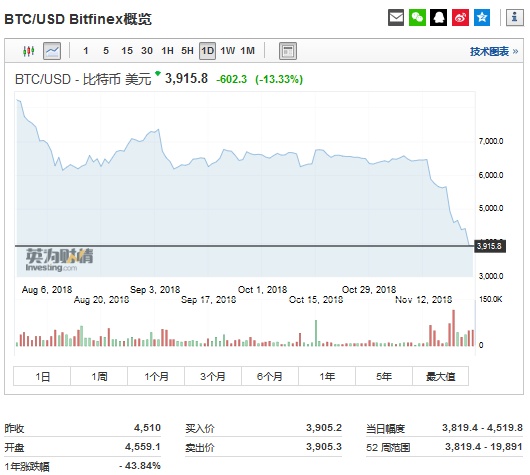 智通财经APP获悉,据多家平台显示,11月25日早间比特币短线大跌,一度逼近3800美元关口,刷新2017年9月以来新低。