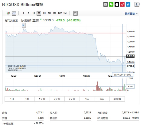 智通财经APP获悉,11月25日,加密货币市场再遭重挫。截至撰稿前,据investing英为财情行情显示,比特币一度跌破3700美元,报3629美元,24小时跌幅超15%,现价报3919.3美元,跌10.82%。