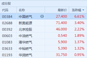 智通财经APP获悉,多方助力燃气板块,截至11时29分,中国燃气(00384)涨6.61%,报价27.4港元,新奥能源(02688)涨3.4%,报71.4港元,北京控股(00392)涨2.22%,报46港元,港华燃气(01083)涨1.37%,报5.9港元。