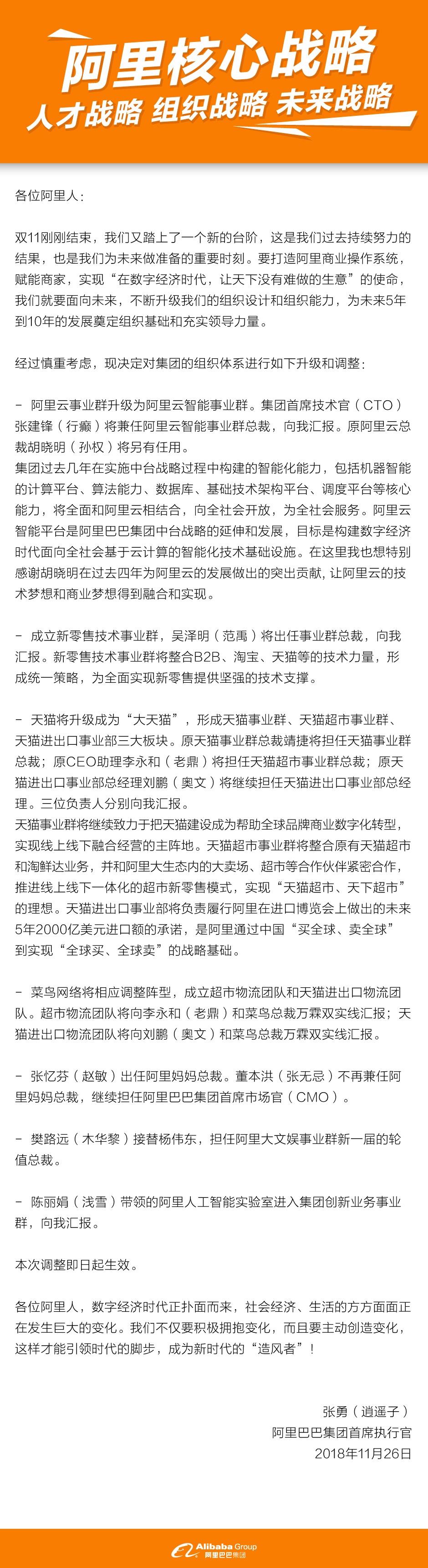以下为阿里巴巴CEO张勇致全员公开信: