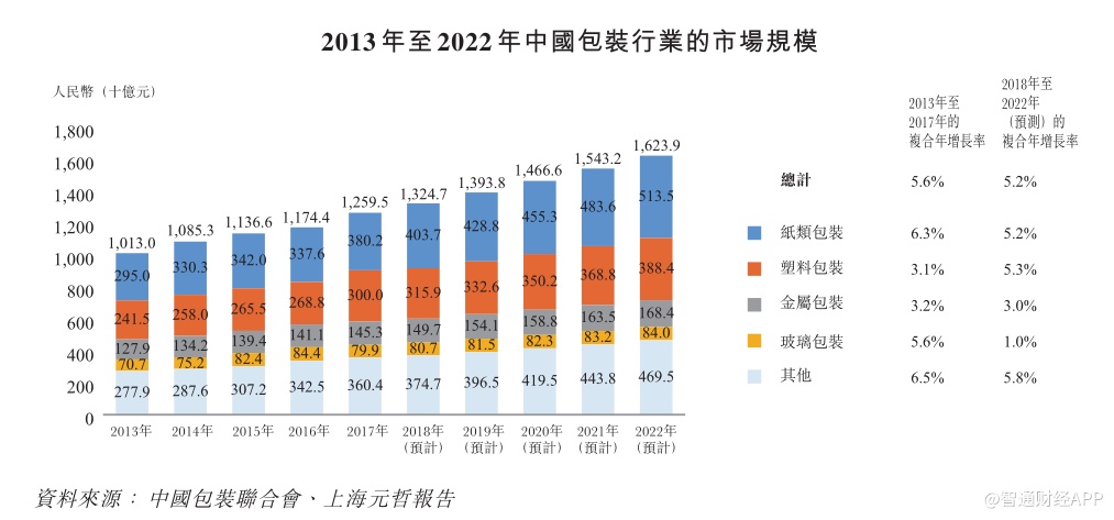 在中国制造业、零售业、物流业及出口贸易的不断发展推动下,中国包装行业的市场规模逐年扩大,由2013年约人民币10130亿元至2017年约人民币12595亿元,复合年增长率约为5.6%。