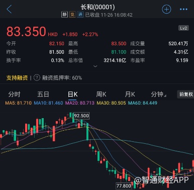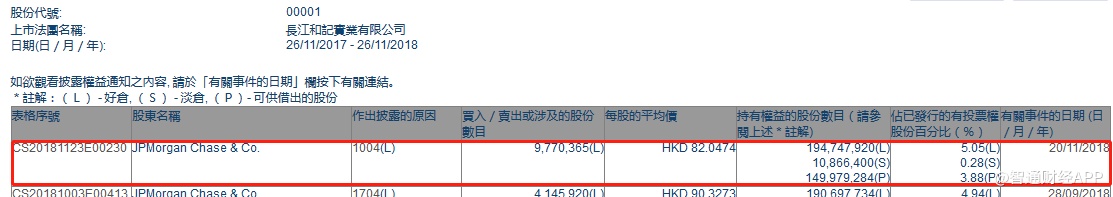 智通财经APP获悉,根据联交所资料显示,摩根大通于11月20日增持长和(00001)977万股,每股作价82.05港元,总值8.02亿港元,最新持股量增至5.05%。