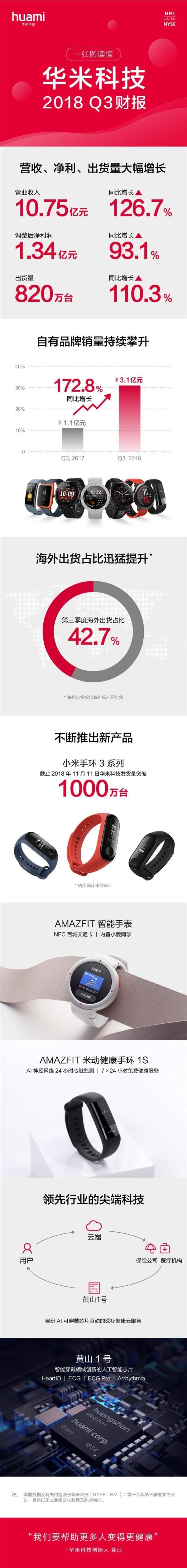 2018年第三季度,华米整体设备的出货量达到820万台,同比增长110.3%。同时华米还在成绩单当中展示了小米手环3的发货量成绩,成绩单显示,截止2018年11月11日,小米手环3系列发货量突破1000万台。