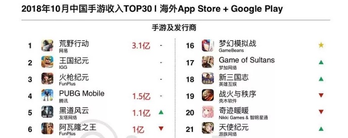 手游收入排行中,《荒野行动》、《PUBG Mobile》分别位列第一、第四名。IGG的《王国纪元》与FunPlus的《火枪纪元》分别位列第二、三名。