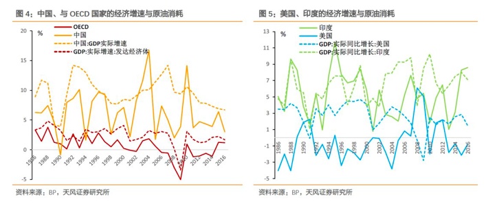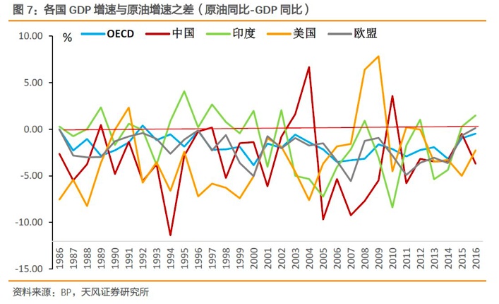 答案是肯定的:各国GDP实际增速明显高于原油增速(其中发达经济体油耗下降的速率很稳定,印度2000年之前油耗并无明显减低,2000年后则油耗下降明显),也就意味着经济增速的原油需求仍会不断下降。