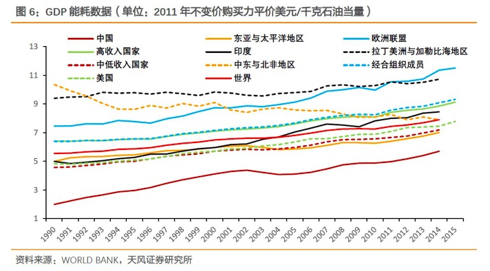 可以看出,中国和东亚太平洋地区的能耗水平目前是最高的(跟生产结构有关,第二产业占比较高明显对能源消耗需求变大,其实中国作为世界工厂,是替全球生产消耗了能源),目前中国以及东亚和太平洋地区的能耗水平,以及经济增速相对较高的中低收入国家的能耗水平都明显高于发达国家,乃至于全球平均水平。